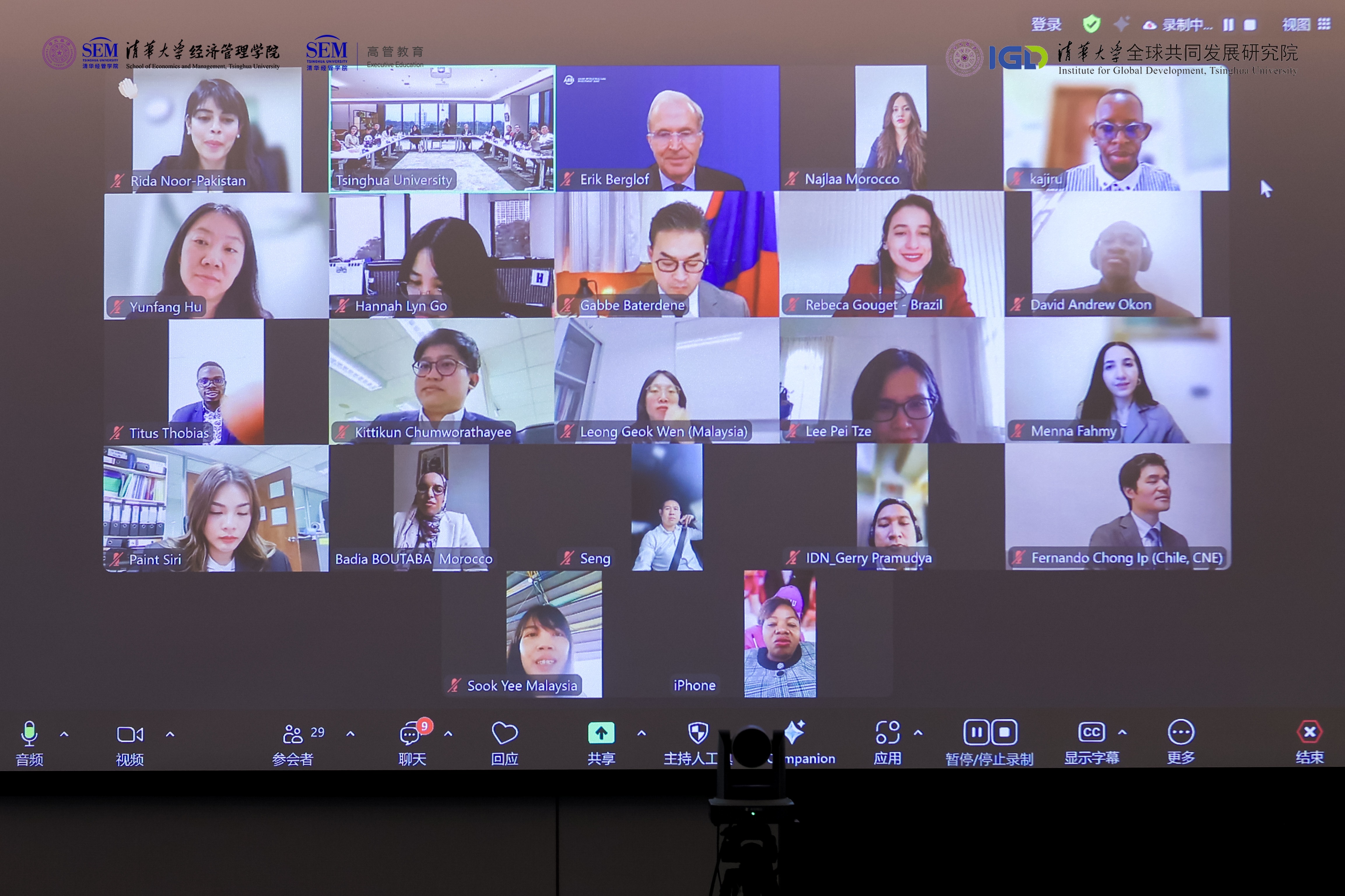 2025年10月10日,首期发展中国家可持续发展卓越人才计划(EPP)在线举行结业仪式。清华大学常务副校长曾嵘,清华大学文科资深教授、清华经管学院院长、清华大学全球共同发展研究院执行院长白重恩,亚洲基础设施投资银行首席经济学家白乐夫(Erik Berglof),伦敦政治经济学院校长拉里·克莱默(Larry Kramer),EPP项目学术主任、清华经管学院经济系长聘副教授曹静,以及36位首期EPP学员共同参加。